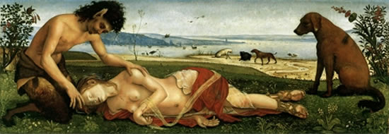 Procris (Piero di Cosimo, 1510). O sêmen do rei Minos, filho de Zeus, era povoado por serpentes, escorpiões e lacraias que matavam suas amantes. Procris teve a idéia de introduzir uma bexiga de cabra em sua vagina para se proteger. Nasceu o preservativo.