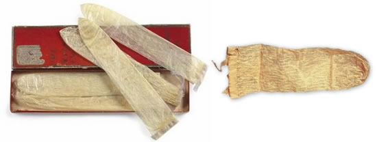 Preservativos de vísceras animais (ceco, bexiga) do século XVII ao XIX.