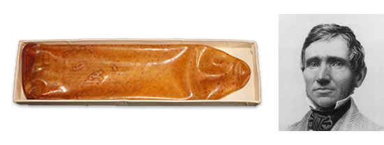 Preservativo de borracha e Charles Goodyear descobridor do processo de vulcanização da borracha.