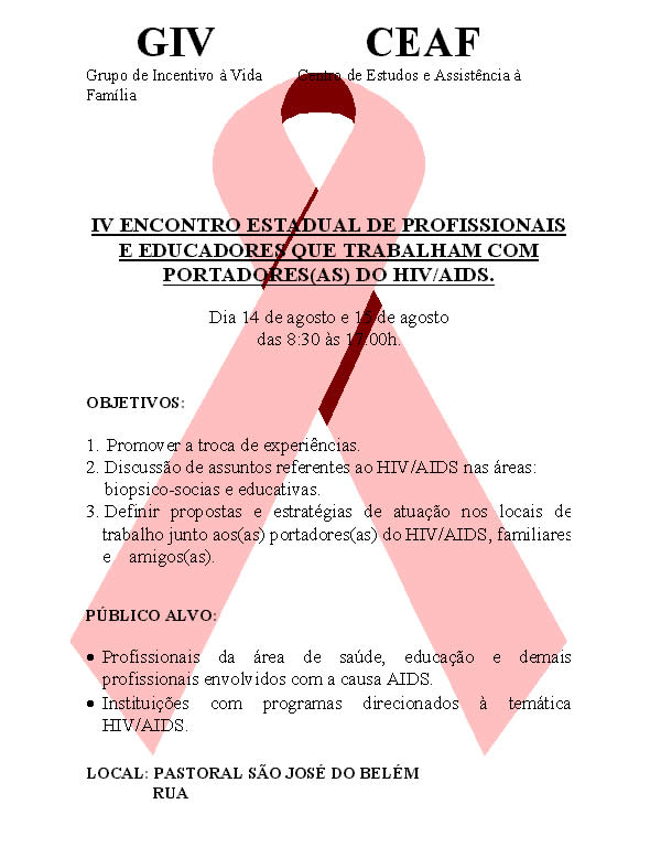 O Encontro Estadual de Profissionais e Educadores(as) que Trabalham com Portadores(as) de HIV/Aids, visa promover a reciclagem das reflexões e ações na atenção às pessoas que vivem com HIV/AIDS, bem como, fortalecer a busca de alternativas para o enfrentamento desta epidemia.